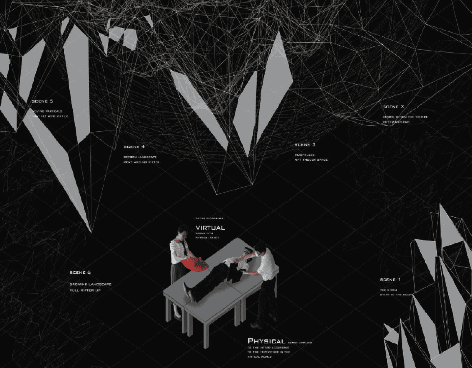 This project have the aim to test the limit of new technology and tries to develop new ways of using these technology into the architecutre industry. The project focuses on virtual reality device, Oculus rift, and aims to create a experince of oating through space. The space is modeled using the program Rhinocerouse to create accurate curve and mesh. Then the model is imported into Cinema 4D for the ainimation. Lastly, the animated model is place into unity to adjust the view for virtual reality goggles, along with the control system for the player.