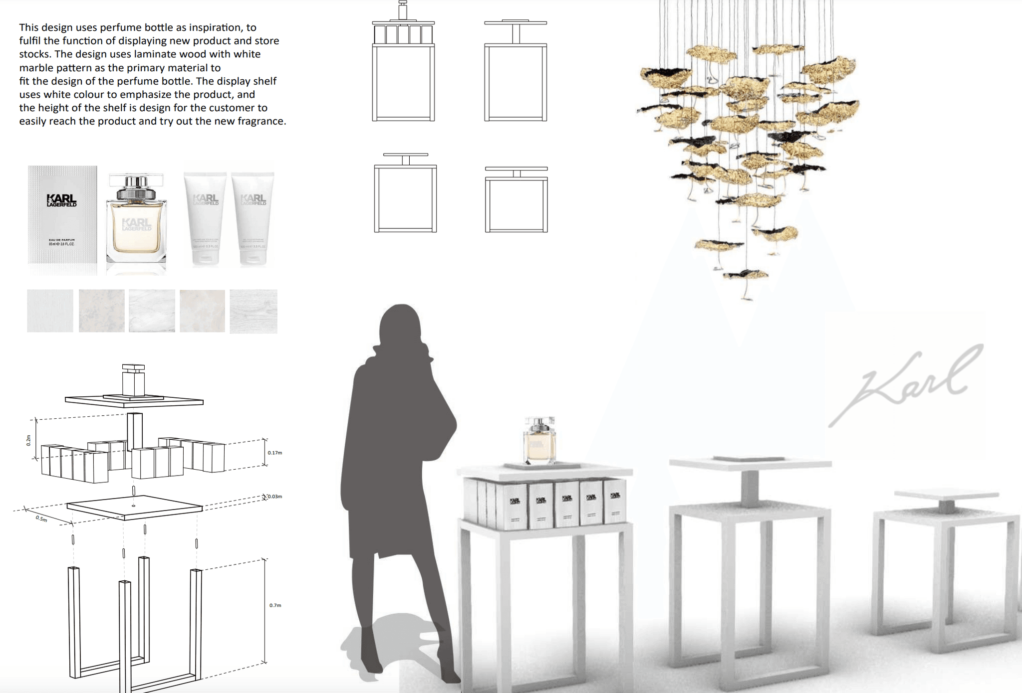 "For the launch of Karl Lagerfeld’s new perfume, I worked on the design of campaign display shelves that echoed the shape and aesthetic of the perfume bottle itself. The concept aimed to create a striking visual connection between the product and its presentation, turning the display into an extension of the brand identity.